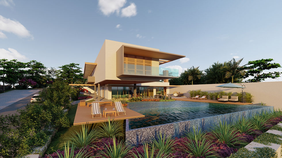Estrutura de concreto armado moldados no local; pergolado em madeira; brises para proteção solar e revestimentos de alto padrão